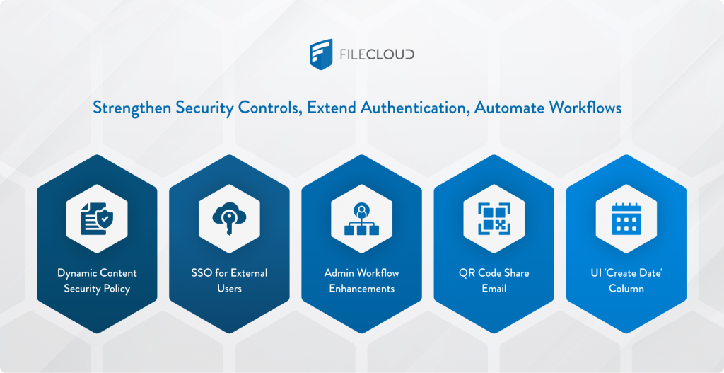 This release continues FileCloud’s security-first approach, introducing support for a dynamic Content Security Policy (CSP), Single Sign-On (SSO) for external users, admin workflow enhancements, and user experience improvements.