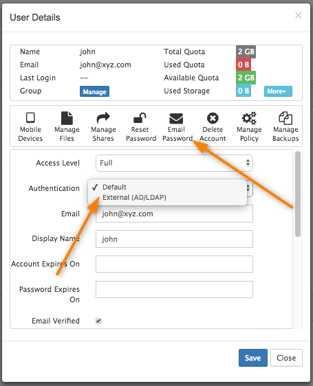 The user can login using Sync App or from Web UI and download all their files. - Ask the user to log in via Web User Portal using the new account/password (AD).